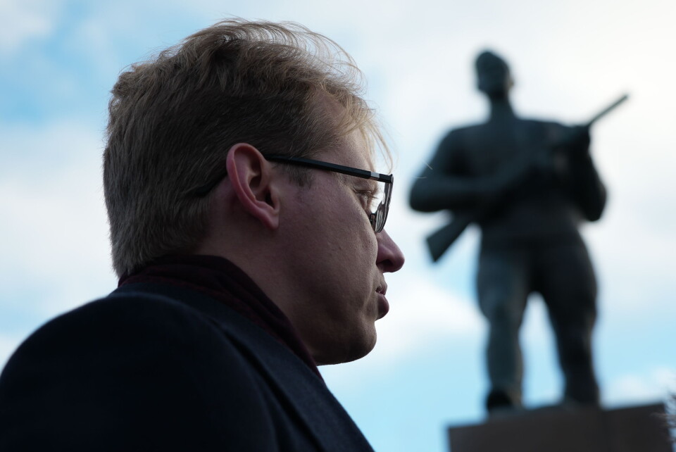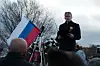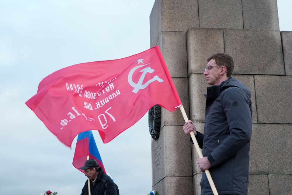 With the Norwegian wreaths on the sideline, the stage in front of the monument was cleared for Nikolai Konygin and his men to enter with a big Russian flag. The diplomat was wearing the St. George's ribbon, a symbol banned from display in several European countries as it is linked to glorifying Russia's ongoing war against Ukraine.